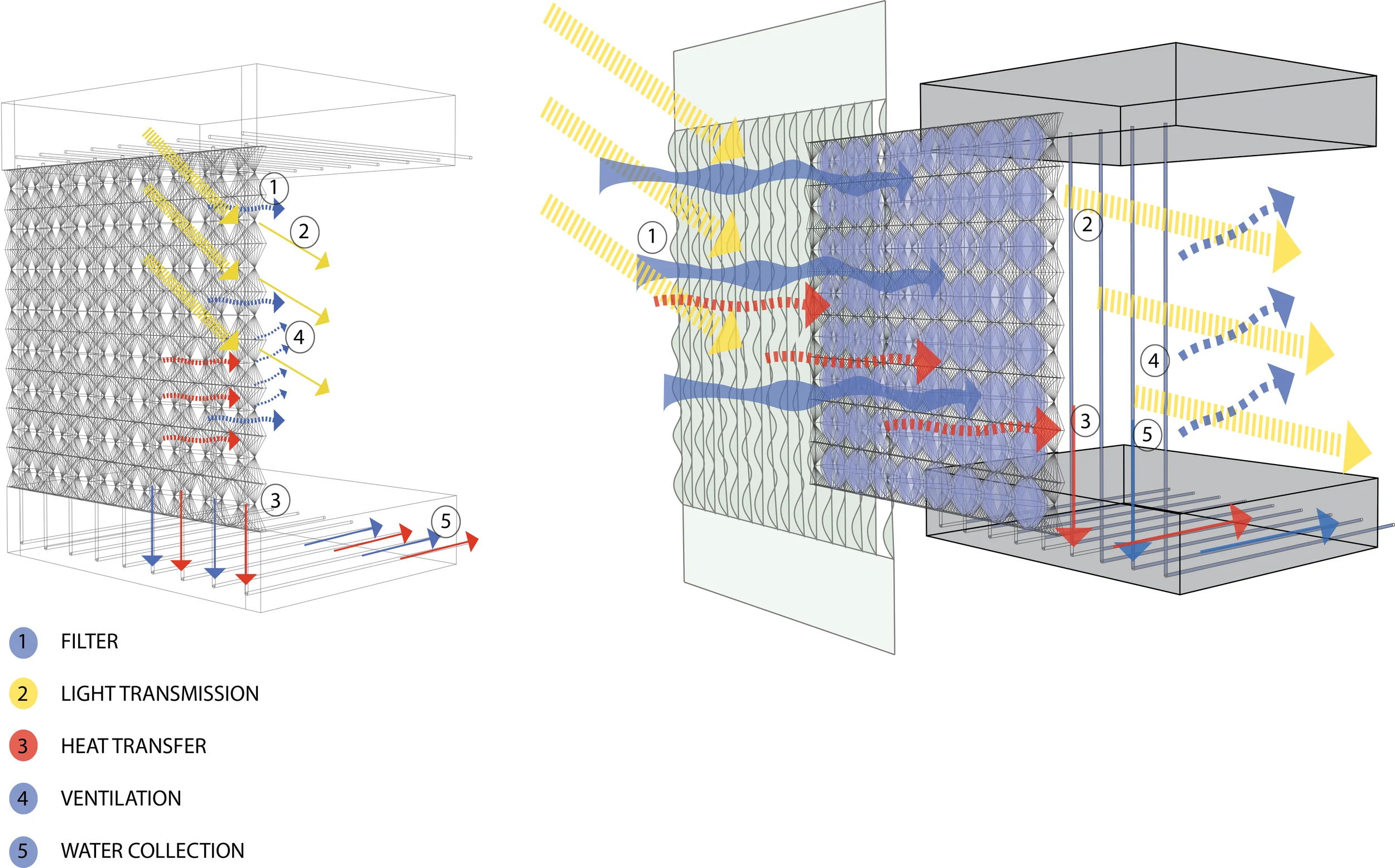 The DRIPS system is the choreography of flexible material tectonics in response to climate forces and interior building demands. Conceived in diurnal cycles that shift from an adsorptive membrane during the night to an insulative membrane during mid-day, DRIPS is an intelligent polymeric envelope design. During regeneration of the adsorptive hydrogel, water condensate is released for potable water use. The insulation membrane expands into full deployment at peak regeneration. The system is dynamic and functions due to the interwoven polymeric elements of flexible polytetrafluoroethylene and hydrogels, which kinetically expand during moisture sorption and contract during synaeresis.